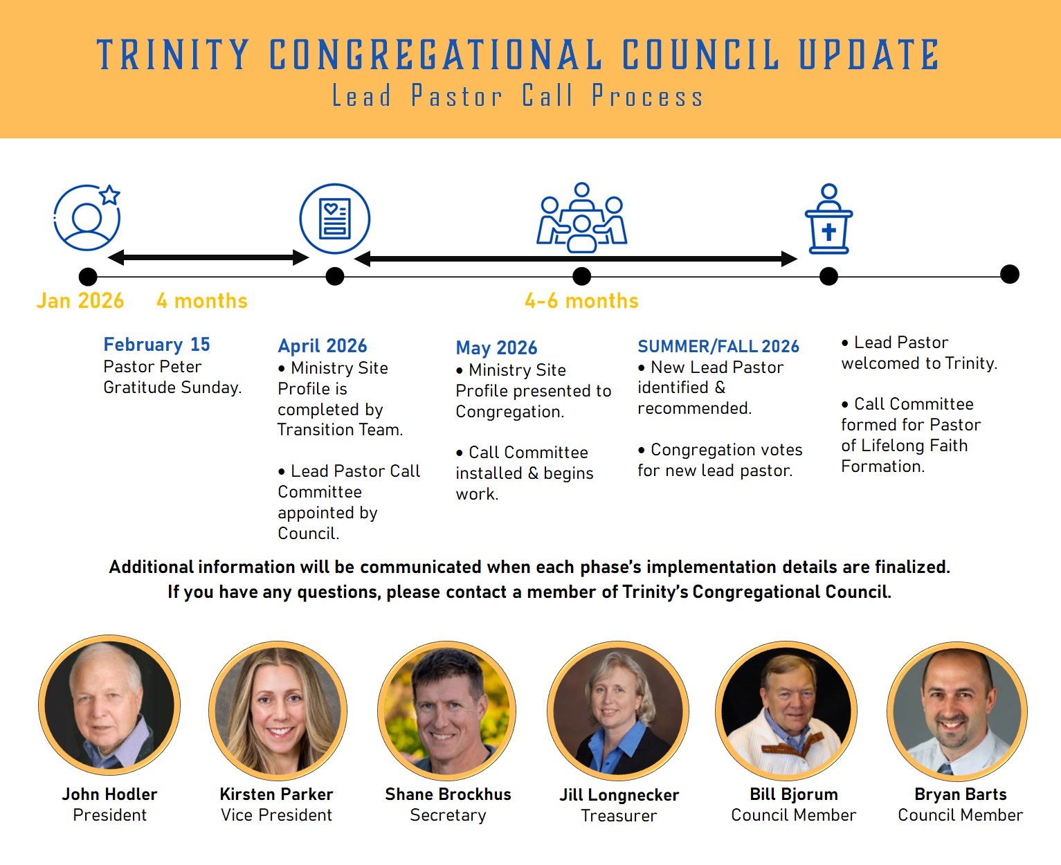 Transition Team: Trinity's Transition Team has been formed! The Transition Team members are Penny Catlin, (co-chair) Gary Cross, (co-chair), Richard Edstrom, Sabrina Fay, Keith Rediske, Kris Torma and Ann Wolff. This dedicated group of volunteers will work closely with staff, council, and members to ensure continuity, gather input, and keep everyone informed every step of the way. We will share more about the team in coming weeks. Please keep them in your prayers as they begin their important work.