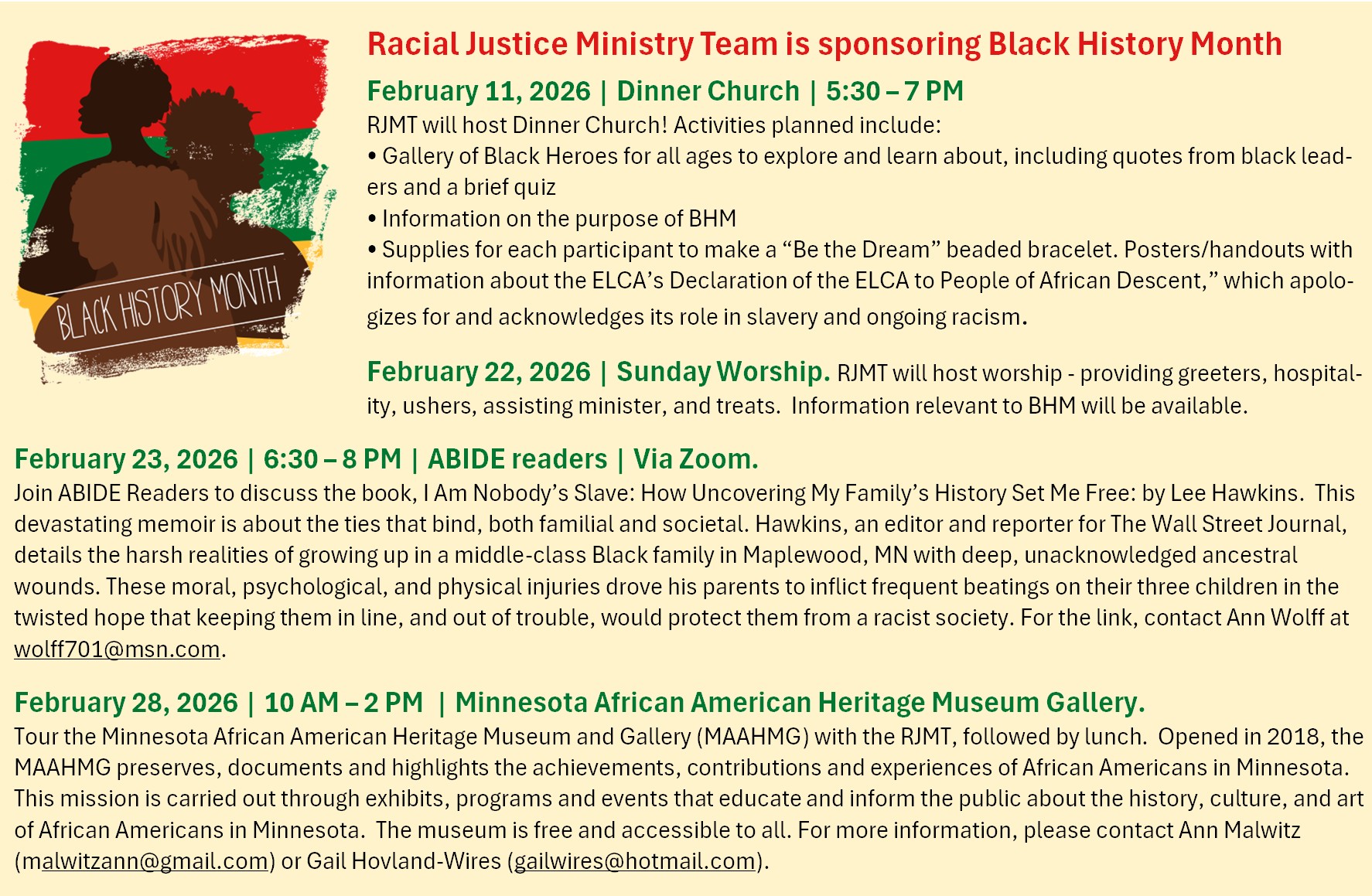 Taking steps individually and as a faith community towards understanding, confronting and dismantling the racial bias and systemic racism that is around us, among us, and within us. This team was formed in the fall of 2020 and is committed to both education and action. If you have a heart for this work and are interested in joining our team, please contact Ann Malwitz, Claudia Swendseid or Ann Wolff.